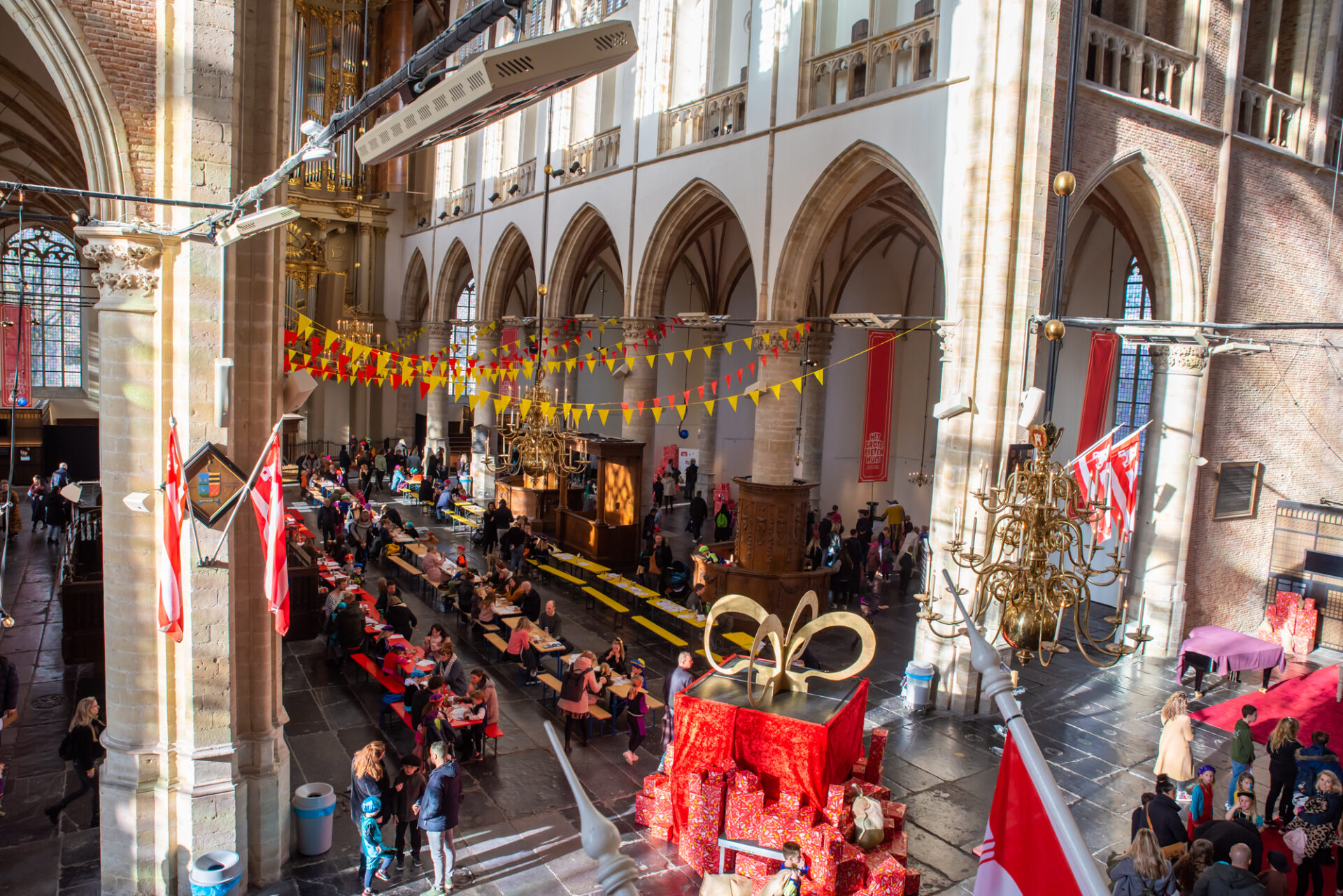 In 2021 transformeerden we de Grote Kerk voor het eerst tot Het Grote Pietenhuis. Een route vol interactieve acts liet kinderen zien hoe de pieten zich voorbereiden op pakjesavond: van pakjes inpakken op de lopende band en verlanglijstjes sorteren tot schoentjes vullen en daken beklimmen. De Grote Brievenbus op het Kerkplein gaf kinderen de kans hun tekeningen en wensen rechtstreeks aan de Sint en zijn pieten te sturen. De ingestuurde verlanglijstjes werden vervolgens opgehangen in de Grote Kerk, zodat kinderen bij hun bezoek met eigen ogen konden zien dat hun brief was ontvangen en gelezen.